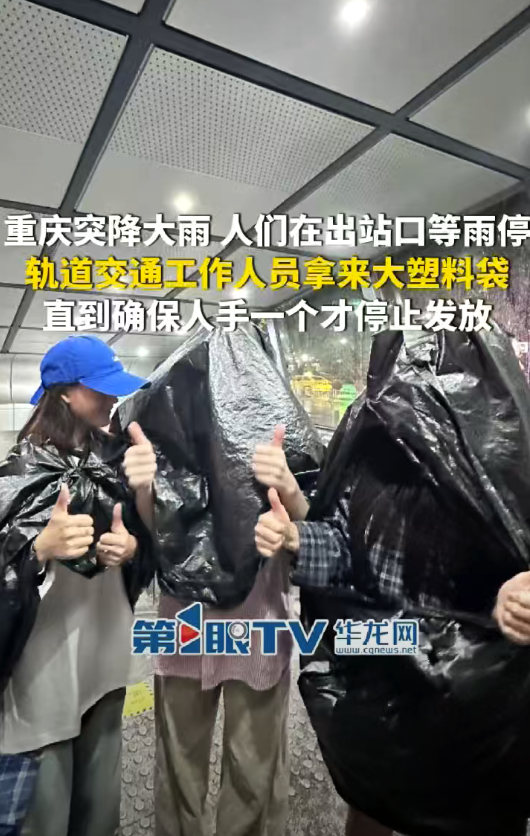 重庆突降大雨,人们在出站口等雨停,轨道交通工作人员拿来大塑料袋,直到确保人手一个才停止发放。